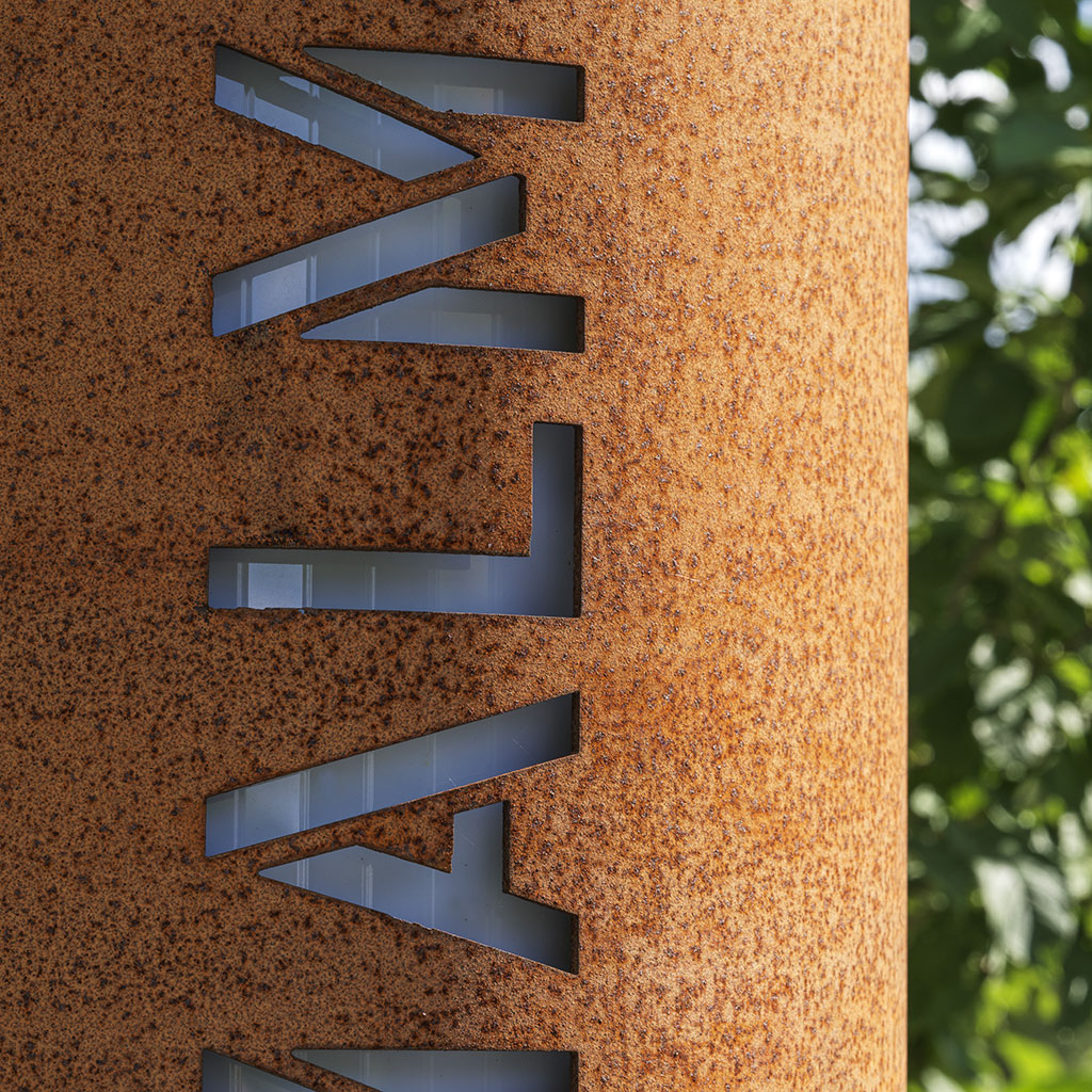Vi skapar rör från Ø10 mm till över Ø500 mm, med utskuren text och figurer som kombinerar funktion och dekor. Ytbehandling anpassas från råmetall och corten till lackerade färger som förstärker varumärke.