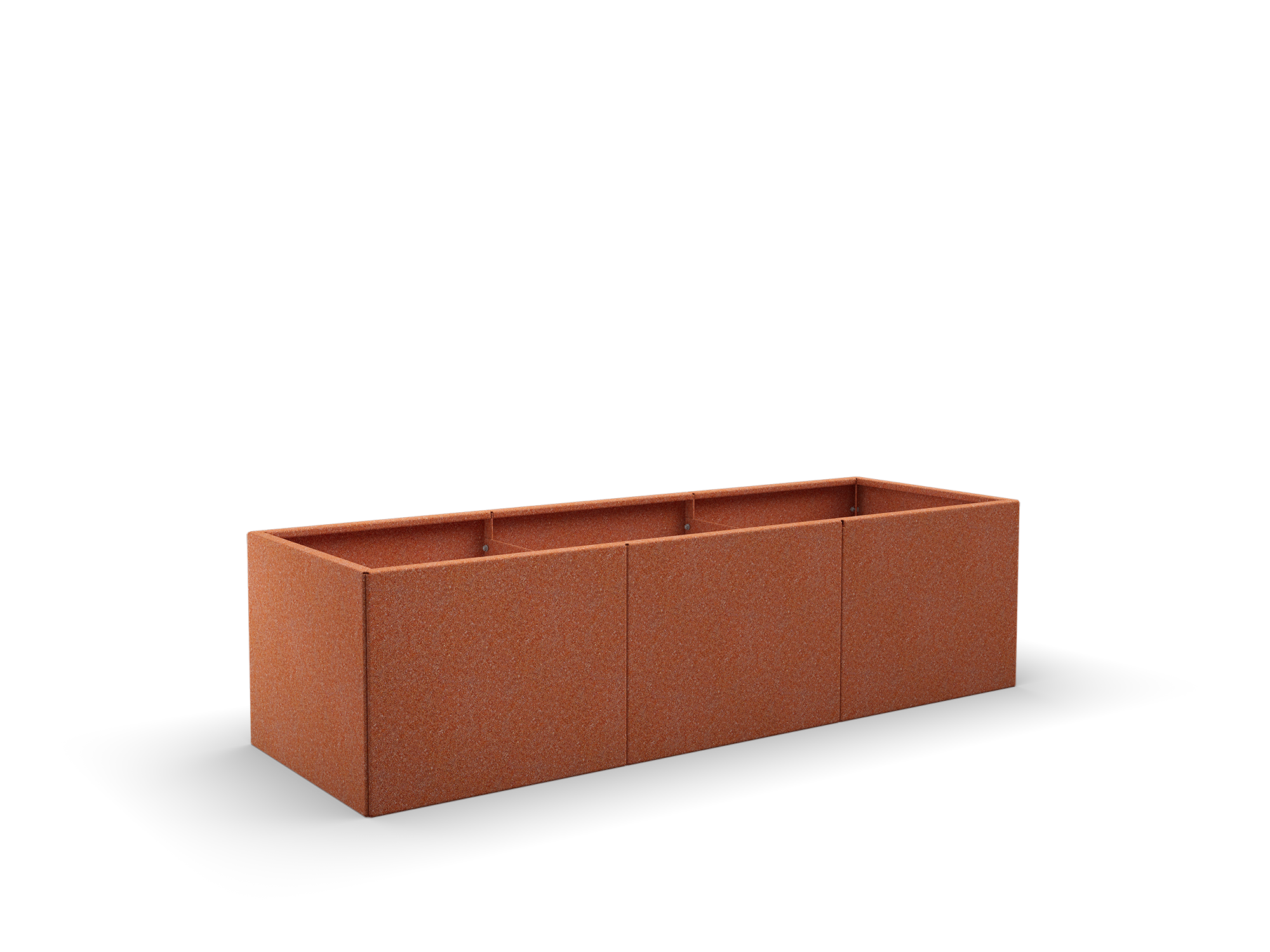 Tillverkad i 3 mm cortenplåt med enkel inbockning i både övre och nedre kant är Rustik H660 extremt stabil och långlivad. Materialet utvecklar med tiden en vacker, rostbrun patina som skyddar stålet mot vidare korrosion, vilket gör produkten underhållsfri och hållbar i många år. Den invikta kanten förhindrar även att lådan sjunker ner i marken.
